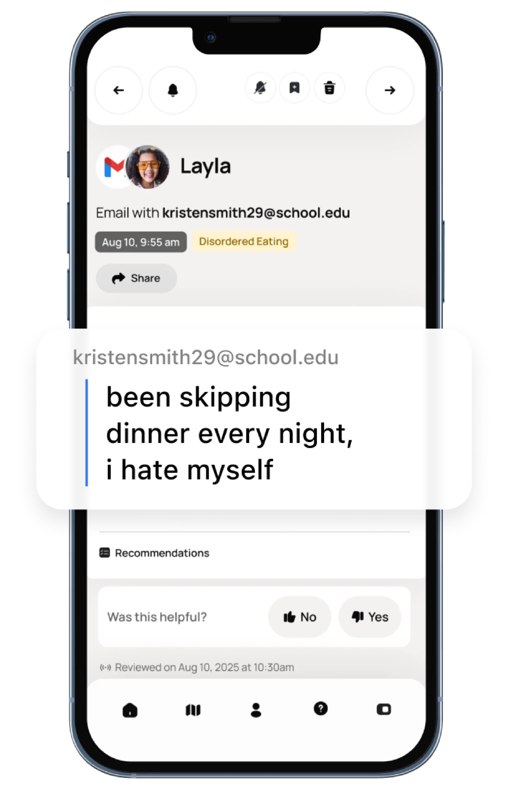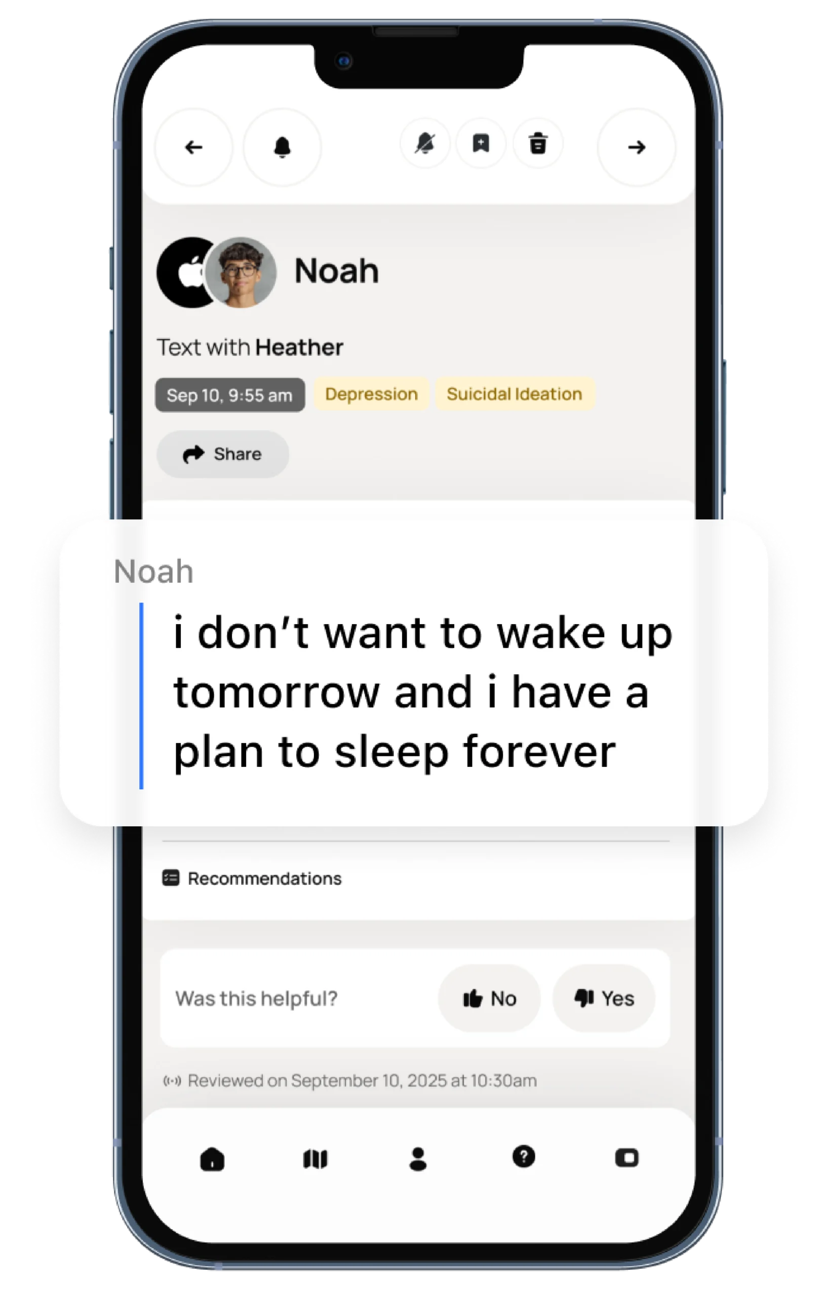 Alerts for potential self-harm and suicide include anything from text messages about cutting to an email draft of a suicide note.