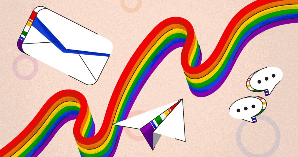 Rainbow ribbon with letters and text bubbles LGBTQ+